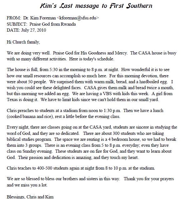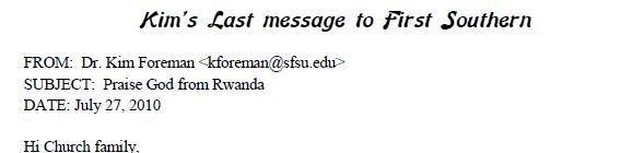 1. Kim's Last email to her church California church speaks elequently of her love for Rwanda and her passion for missions ~ July 27.![]() |