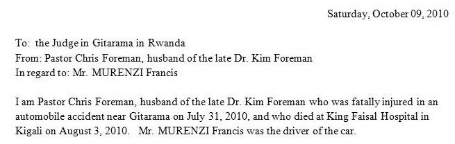 9. This is the "mercy letter" that Chris sent to Frank Murenzi, forgiving him for his involvment in the car crash ~ October 9![]() |