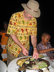 The best fish I ever had was in Burundi. Here it is. Every time we go to Brundi, we go to a beach restaurant and eat fish caught from Lake Tanganyika. Chris is serving to us. I hope he washed his hands.