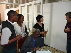 We continued to use different tools to develop stories. There is only one scanner at the ICT center, so everyone had to take their turn to use it. I found ImageReady software to use the scanner. Most of them never used a scanner before, so it took some time to learn to use it. These professors are so eager to learn, everything that I show, they want to learn. There is no formal class meeting today. Everyone is doing their own thing. Some people went out to take pictures using my camera, some went to the computer lab to use Photostory, and some scanned their pictures. We suppose to meet between 9 am to noon. But it is 6 p.m now, and there are four professors are still working on their project. Faustin, Emmanual, and Charles are still in the room working on their project.